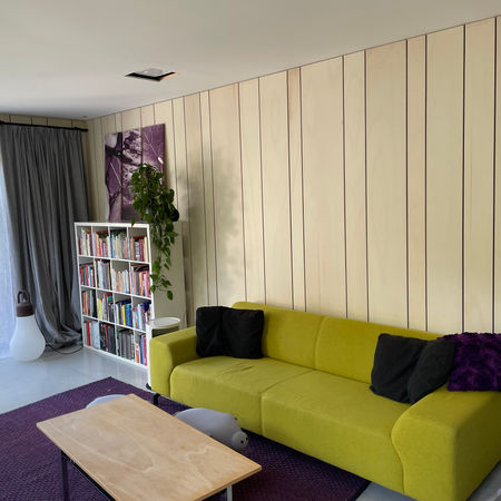 Om een woning met een betonvloer wat warmte te geven, heb ik voor populier multiplex gekozen. Tussen de planken is paars vilt aangebracht als accent kleur.